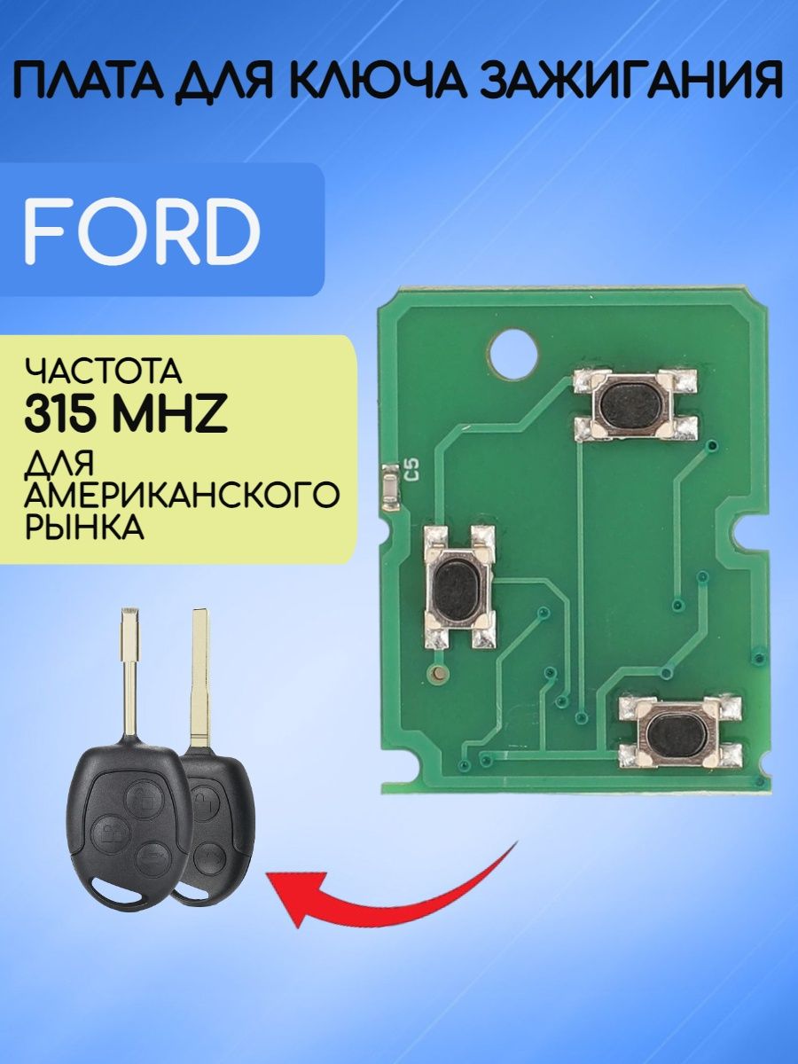 Плата для автомобильного ключа зажигания Ford / Форд. Частота 315 Мгц. Частота 315 Мгц предназначена для американского рынка. Перед покупкой убедитесь что ваш автомобиль поддерживает комплектацию с пультом дистанционного управления. Также обратите внимание на частоту ключа бывает 433Mhz или 315 Mhz. На этих платах можно менять частоту вручную, для этого нужно ОДНОВРЕМЕННО нажать кнопки Закрыть + Открыть ( именно одновременно, не всегда получается с первого раза) и удерживая их нажать 4-6 раз кнопку багажника. Желательно иметь частотометр, для того что бы сразу проверить, поменялась ли частота платы. Перед использованием надо запрограммировать данную плату ручной процедурой ) :1. Для программирования новых ключей ford с высокочастотным пультом дистанционного управления поверните ключ в замке зажигания в положение II четыре раза в течение шести секунд.2. Поверните ключ в замке зажигания в положение О. Звуковой сигнал подтвердит, что в течение 10 секунд у вас есть возможность запрограммировать ключи.3. Нажмите на любую кнопку нового ключа форд фокуса. В качестве подтверждения раздастся звуковой сигнал. Повторите это последнее действие для всех ваших ключей с высокочастотным пультом дистанционного управления, включая оригинальные ключи. Не вынимайте ключ из замка зажигания при нажатии на кнопку на данном ключе.4. Снова включите зажигание (положение II) или подождите десять секунд, не приступая к программированию следующего ключа, чтобы закончить процедуру программирования текущего ключа. После выполнения этой процедуры вы сможете запереть и отпереть замки вашего автомобиля лишь при помощи только что запрограммированных ключей с высокочастотным пультом дистанционного управления. Совместимость : FOCUS; MONDEO; GALAXY; C-MAX; FIESTA.