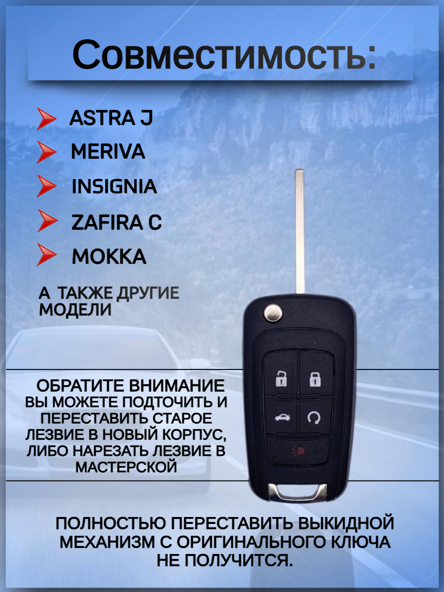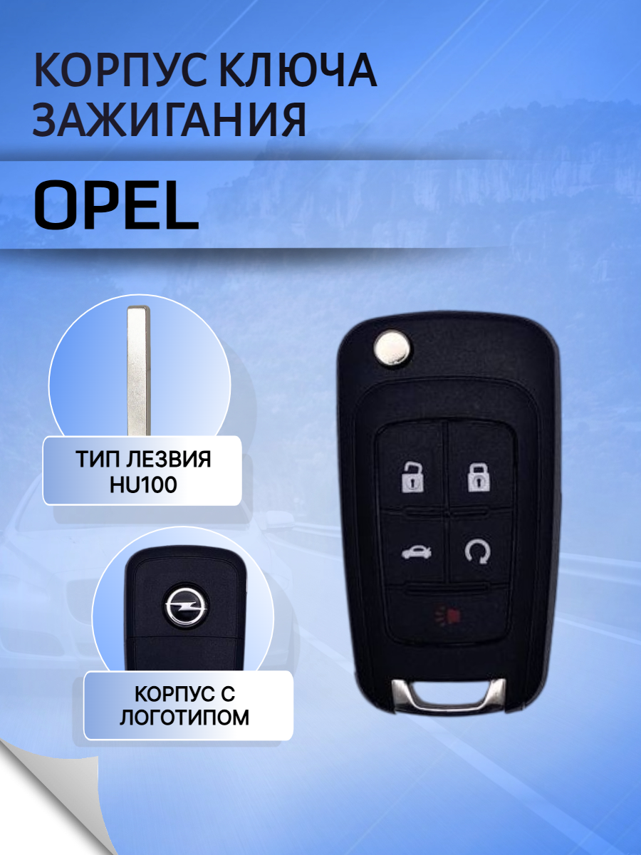 Корпус выкидного ключа зажигания автомобиля для Opel / Опель. 4 кнопки. Тип лезвия HU100. Предназначен для замены изношенного корпуса ключа на новый - если стерлись кнопки, повредился корпус, а также отломалось лезвие ключа. Вы можете заменить его на новый. Идеальное решение вашей проблемы! Подходит для: Opel Insignia / Astra / Zafira / Adam / Cascade / Mokka / Zafira C и других моделей. Примечание: Этот товар не является дистанционным ключом, это просто корпус дистанционного ключа, в нем нет платы и чипа. Лезвие нарезается отдельно, все внутренности переставляются из оригинального ключа, не забудьте переставить чип! Заменить старый корпус и нарезать новое лезвие под ваше оригинальное Вы сможете обратившись в ближайшую мастерскую.