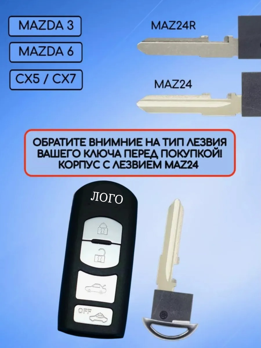 Корпус смарт ключа зажигания автомобиля с 4 кнопками для Mazda. Логотип и сервисный ключ входят в комплект. Тип лезвия MAZ24. Предназначен для замены изношенного корпуса ключа на новый - если стерлись кнопки, повредился корпус. Вы можете заменить его на новый. Идеальное решение вашей проблемы! Подходит для: MAZDA 2 / MAZDA 3 / 6 Wagon / MAZDA CX-5. Важное примечание:1. Этот товар не является пультом дистанционного управления, это просто корпус дистанционного ключа для замены. 2. Внутри нет Платы и чипа. 3. Ключ должен быть одинаковым. Пожалуйста, внимательно проверьте это. Лезвие нарезается или перекидывается со старого ключа. Все внутренности переставляются от оригинального ключа, ВНИМАНИЕ, не забудьте переставить чип! Корпус ключа аналогичен штатному и поддерживает те же функции. Заменить корпус старого ключа Вы можете как самостоятельно, так и обратившись в ближайшую мастерскую.