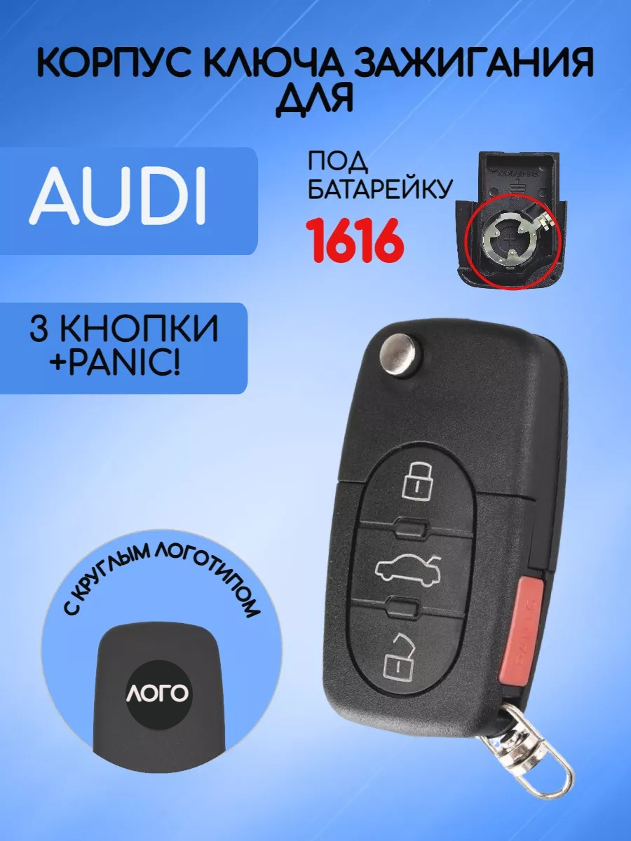 Корпус выкидного ключа зажигания с 3 кнопками +PANIC! для Ауди / Audi с типом лезвия HU66. Обратите внимание, корпус с круглым логотипом, как на нашем фото. Предназначен для замены изношенного корпуса ключа на новый - если стерлись кнопки, повредился корпус или отломалось жало. Вы можете заменить его на новый.