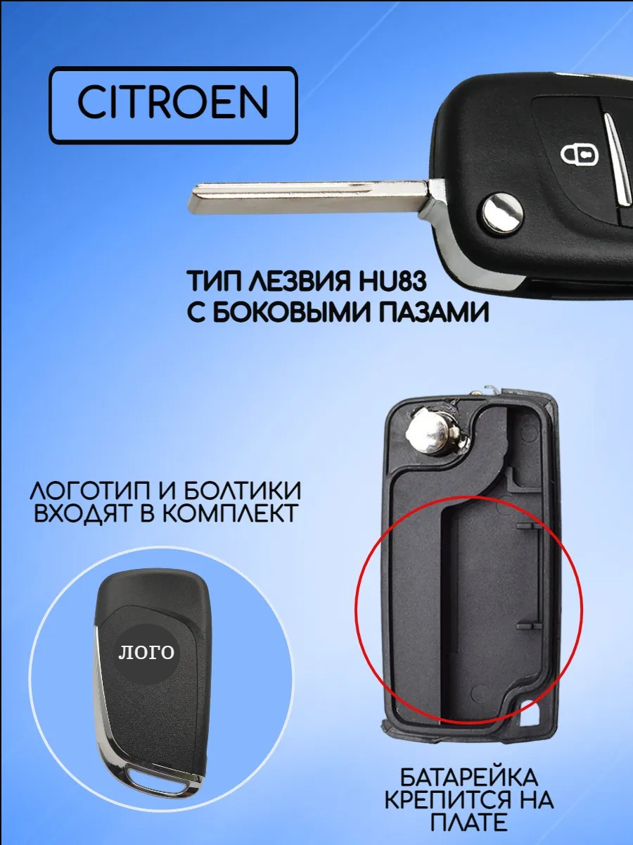 Корпус выкидного ключа зажигания автомобиля с 3 кнопками Citroen C4, C2 и другие. Тип лезвия HU83. Обратите внимание на расположение батарейки в корпусе Вашего ключа, она должна крепиться на плате ключа. Логотип входит в комплект! Предназначен для замены изношенного корпуса ключа на новый - если стерлись кнопки, повредился корпус. Вы можете заменить его на новый. Так же можно заменить старый корпус на новый модифицированный. Идеальное решение вашей проблемы! Подходит для: Ситроен / Citroen C4 / C2. Важное примечание: 1. Этот товар не является пультом дистанционного управления, это просто корпус дистанционного ключа для замены. 2. Внутри нет Платы и чипа. 3. Ключ должен быть одинаковым. Пожалуйста, внимательно проверьте это. Лезвие нарезается отдельно. Все внутренности переставляются от оригинального ключа, не забудьте переставить чип!