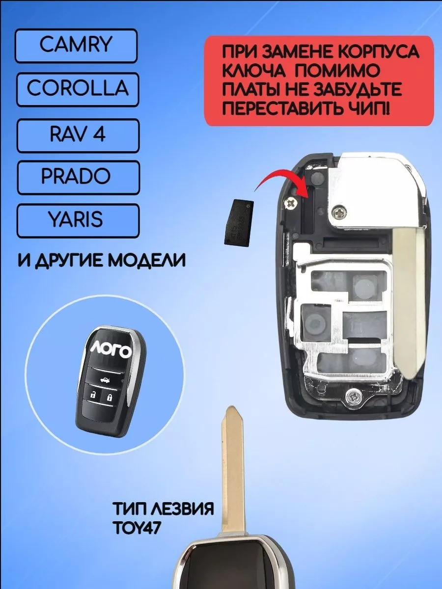 Корпус выкидного ключа зажигания 2 / 3 на выбор для Toyota. Тип лезвия TOY47. Все внутренности переставляются из оригинального ключа, помимо платы необходимо переставить чип в предназначенный для отсек рядом с лезвием. Лезвие нарезается отдельно. Корпус с логотипом. Предназначен для замены изношенного корпуса ключа на новый выкидной - если стерлись кнопки, повредился корпус, а также отломалось лезвие ключа. Сделайте апгрейд Вашего ключа! Подходит для Toyota Rav4 / Corolla / Hilux / Yaris / Avalon / Echo / Prado и другие модели, если Ваш ключ выглядит как на нашем первом фото. Примечание: Этот товар не является дистанционным ключом, это просто корпус дистанционного ключа.